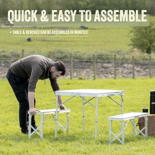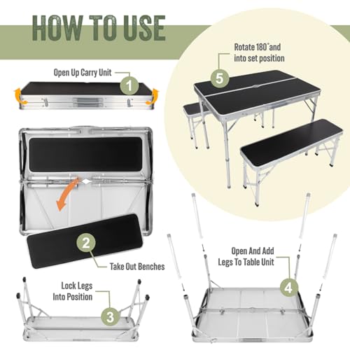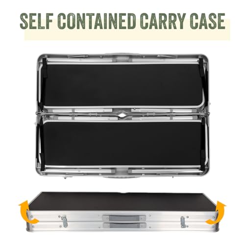 - محمولة ومتينة - مصنوعة من الألومنيوم القوي، تتميز هذه الطاولة بسعة تحميل قصوى تصل إلى 40 كغم، وتتميز المقاعد بسعة حمل قصوى تصل إلى 110 كجم. بمجرد الانتهاء من استخدامها، يمكن طي المجموعة بسهولة في حقيبة الحمل حتى تتمكن من تخزينها ونقلها بأمان.
