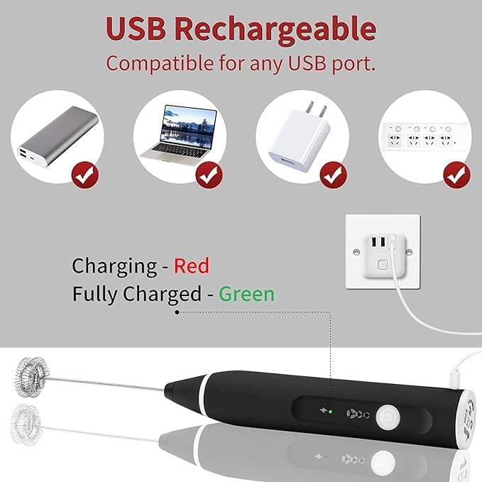 - Fast Charging and Easy to Carry Handheld Milk Frother Maker is powered by built-in rechargeable battery, no need to replace the battery, it is environmentally friendly and save money. Equipped with a USB charging cable and charging port for you to charge on any USB interface, suitable for you to use in your home, office, camping or travel. It is eco-friendly and saves you money!!!! !