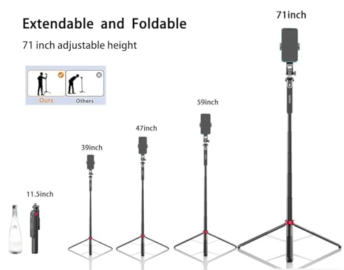 - 【71inch Extra Long Tripod for Iphone &4 legged Design】The selfie stick tripod with remote is extended length up to 71inch,longer and more stable than regular 3 legged tripod。 the tall tripod for Phone,upgraded quadruped and wide base design.the fold length is only 11.6inch easy to carry. this fast and extendable tripod provides a convenient solution for capturing the perfect shot.