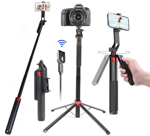 - [Multi-Role & Extremely Augmentability ] 2 in 1 multifunctional portable tripod can be used as both a selfie stick for iPhone. Mounted on the top of the cell phone tripod stand with universal 1 /4" screws that can be connected to most cameras, action cameras, and GoPro. Let this tripod stand around with you from office to everywhere, from novice to professional. It’s Perfect for selfies, group photos, adventure travel, vlogging, YouTube, tiktok videos, FaceTime, Instagram.