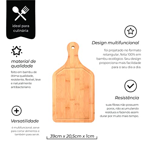 - DESIGN: Our cutting board is rectangular shape, made entirely of bamboo which increases its durability. It is multifunctional and practical, ideal for daily life and your cutting needs. Its measurements are: length: 39 cm, width: 20.5 cm and height 1 cm and weighs 455 g