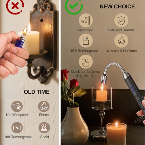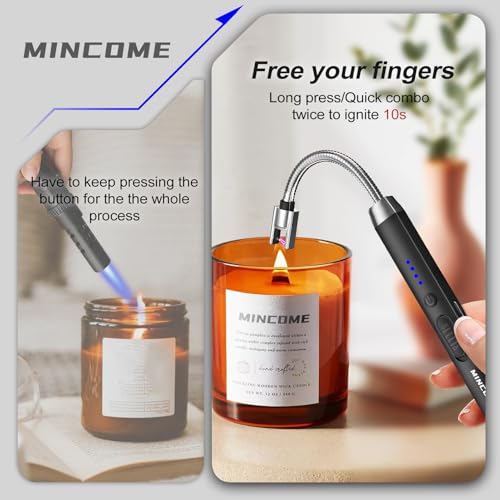 - Upgraded —Hands-Free - Our candle lighter has been upgraded with a quick double-click button that releases an electric arc and lasts for 10 seconds. You will no longer need to hold down the ignition button while lighting multiple candles.