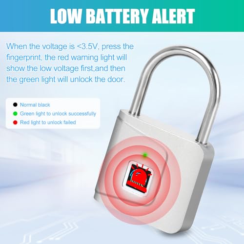 - USB charging function: fingerprint lock has lower power consumption, supports 4000 hours standby time and can be unlocked more than 1800 times. Padlock fingerprint products contain low battery reminders, and a red warning light will light up, fingerprint padlock when you press your fingerprint, which is a thoughtful reminder, so you don't have to worry about suddenly running out of battery.