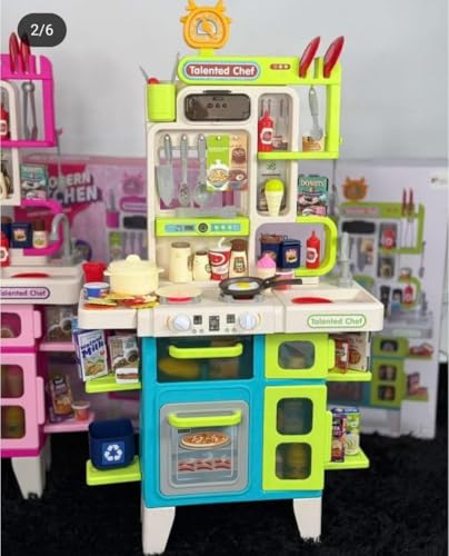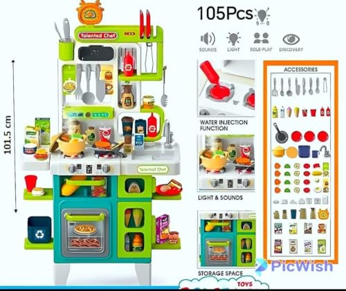 - The kitchen comes with a wide range of colorful accessories that vary between cookware, various food figures and juices, providing hours of creative play.