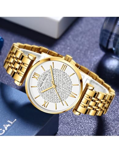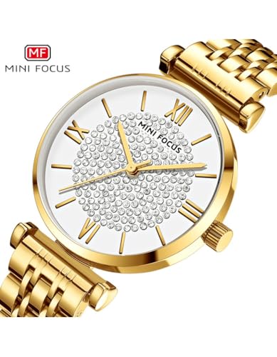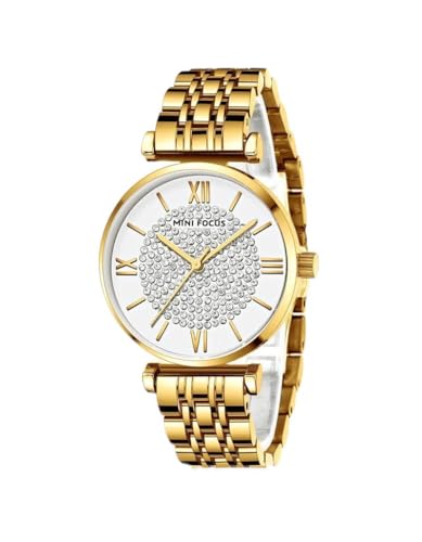 MF MINI FOCUS - ساعة يد من الستانلس ستيل بلون ذهبي ومينا مرصع بالكريستال وهيكل 38 ملم موديل MF0334L.02، تناظري