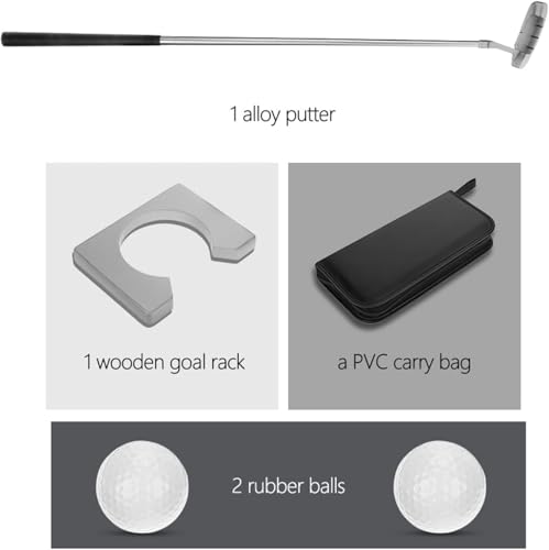 - Package: Small Indoor Home Golf Set Contains 1 Golf Club, 2 Golf Balls, 1 Goal Holder And Carrying Bag. Removable Right Handed Use: The portable putter set is removable and easy to carry The elastic waist band in the carrying case keeps cup perfectly in place. Material: The adjustable golf rackets set is made of aluminum alloy and the club head is made of zinc alloy which provides great strength and long service life. Feature: The small indoor putter can effectively help you train frequently and improve your playground positioning skills. Usage: Indoor Golf Training Clubs Set Is Suitable For Killing Time, Indoor Workouts, Improving Their Golf Skills And So On.