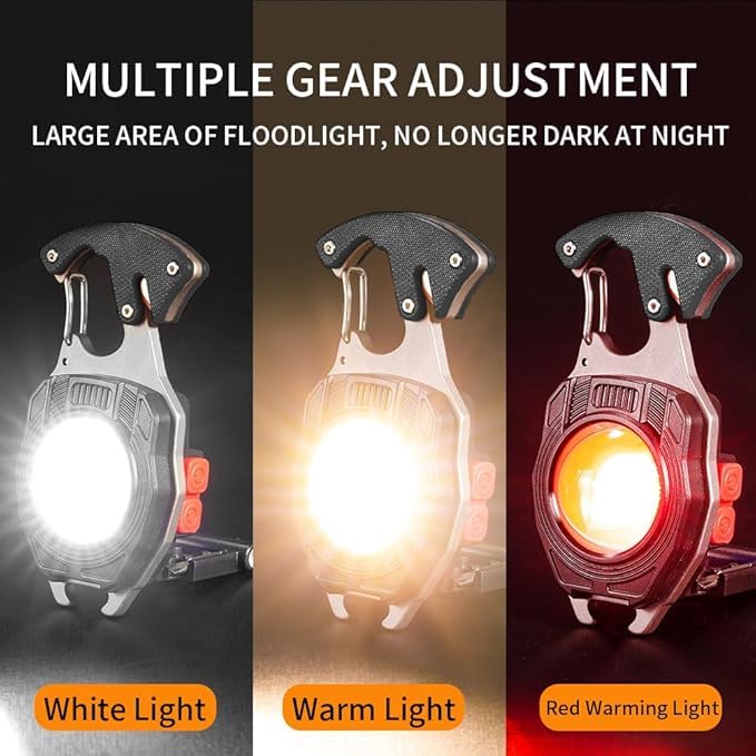 Generic - مصباح يدوي ليد صغير بميدالية مفاتيح، مصباح عمل صغير سي او بي متعدد الوظائف بسطوع 500 لومن قابل لإعادة الشحن، كشاف بـ 7 أوضاع إضاءة مع ولاعة كهربائية وقاطع حزام الأمان ومفك وصفارة