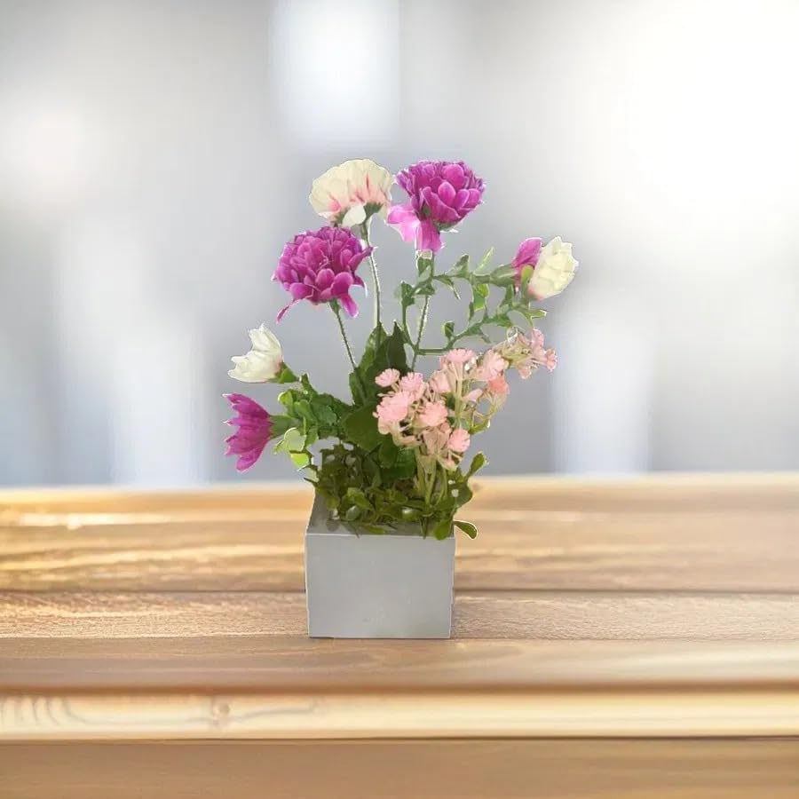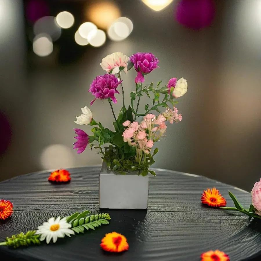 - Stylish and attractive design: Mini vase with trendy gray base with a variety of artificial flowers in pink, purple and white