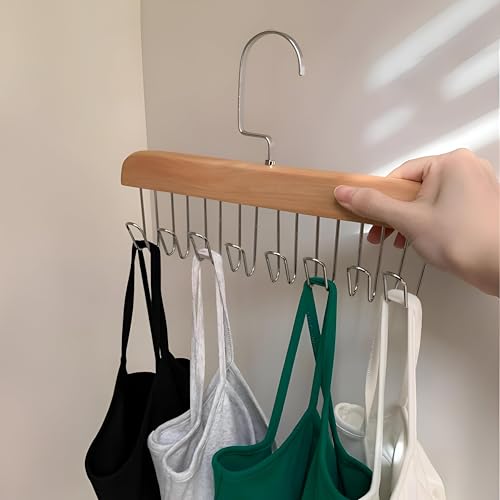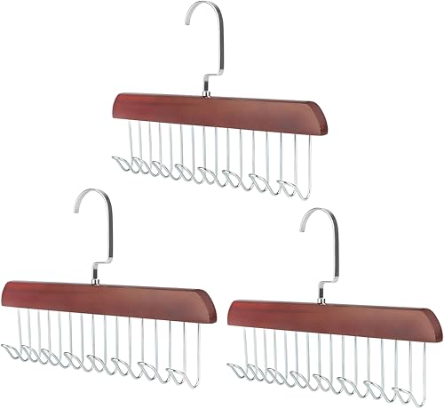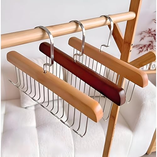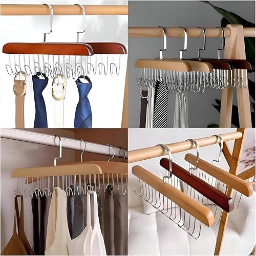 - This wooden organiser features 8 rotating metal hooks that allow you to hang up to 24 items—including ties, belts, scarves, and handbags—vertically, saving up to 70% more closet space than traditional hangers, making it ideal for small living areas or shared wardrobes.