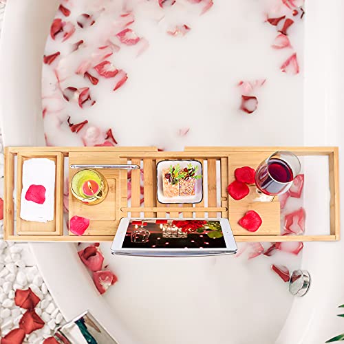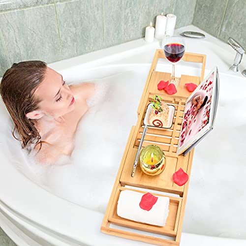 minqi - صينية حوض الاستحمام من خشب الخيزران قابلة للتوسيع مع حامل كتب لحمام فاخر، طاولة حمام منظمة من مينكي، (لون طبيعي ايه)