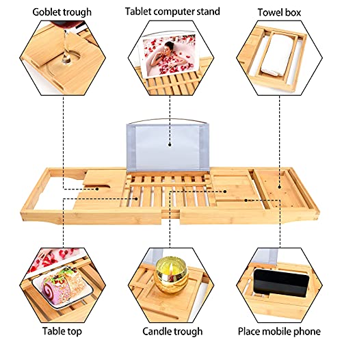 - استخدام متعدد الوظائف: طاولة حمام متعددة الاستخدامات من خشب الخيزران، تحتوي على العديد من الأقسام لحمل مجموعة متنوعة من العناصر المختلفة، كما أنها تتميز بفتحة منزلقة لأكواب العصائر الزجاجية ومساحة للموبايل ومساحة للشموع وأدوات النظافة وما إلى ذلك.