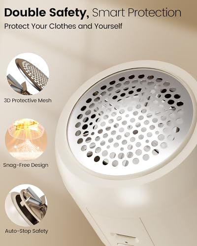 - 🛡️ 𝐃𝐮𝐚𝐥 𝐏𝐫𝐨𝐭𝐞𝐜𝐭𝐢𝐨𝐧 𝐟𝐨𝐫 𝐘𝐨𝐮 & 𝐘𝐨𝐮𝐫 𝐂𝐥𝐨𝐭𝐡𝐞𝐬: Thoughtfully designed to refresh your favourite knitwear and wool jumpers. The upgraded 3D thickened honeycomb fabric guard gently shields fabrics from snags or damage, while the automatic safety stop instantly powers off when the shaving head is removed or loosened, preventing accidental contact and keeping you safe. Turbo-fan airflow captures lint as you trim to prevent scattering, and the extra-large lint chamber keeps your clothes fresh and your home tidy with less frequent emptying