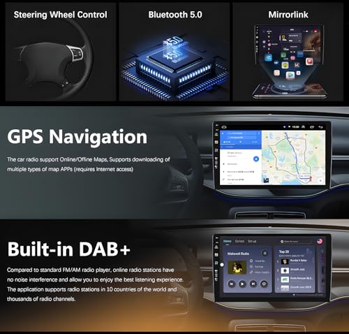 - 【Built in DAB+】Enjoy high-quality digital audio broadcasting, providing a wider range of radio program choices with high clarity and no interference 【GPS Navigation】Offline Map With pre-loaded map. Online Map suitable routes can be selected based on real-time road conditions by using online map.