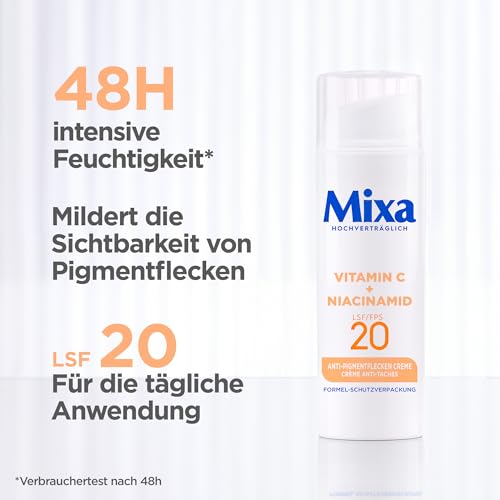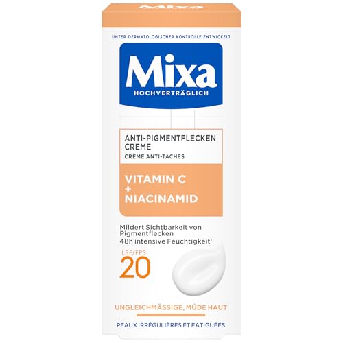 Mixa - كريم للتصبغات، للبشرة غير المتجانسة والباهتة والحساسة، غني بفيتامين سي والنياسيناميد، للاستخدام على الوجه والرقبة، من ميكسا بمعامل حماية من الشمس 20، تركيبة هيبوألرجينيك، سعة 50 مل