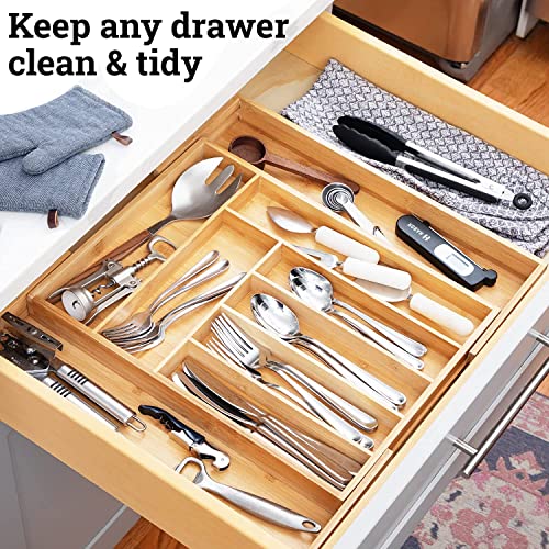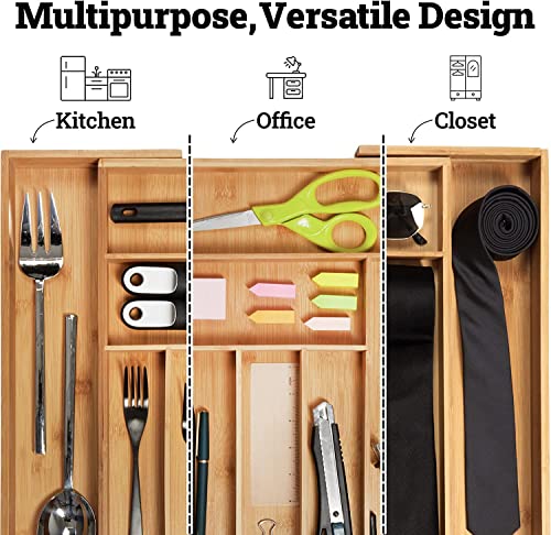 - 💙EXTRA COMPARTMENTS ALLOW FOR MORE ORGANIZATION - This kitchen drawer organizer is created with extra compartments which allows you to maximize your storage. The expandable design offers up to five separate compartments for you to neatly store utensils, office supplies, makeup and more.