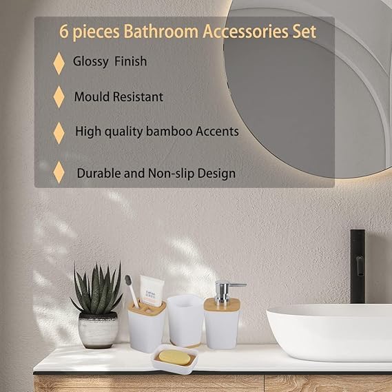 MJ - MJ Modern 6-Piece Bathroom Accessories Set, White and Natural Wood, with Trash Can, Toothbrush Holder, Soap Dispenser (WHITE)