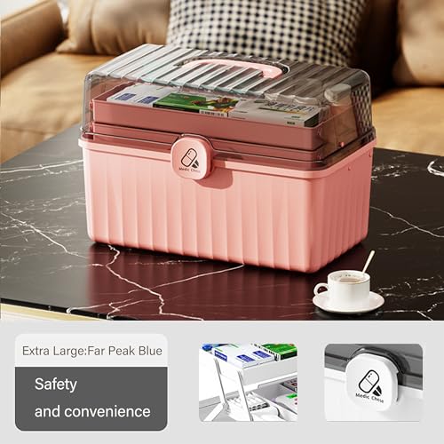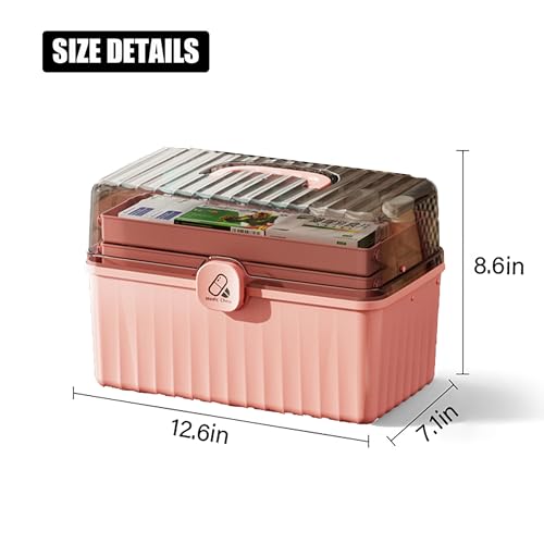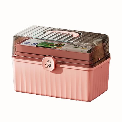 MJRlrifa - Large Medicine Medical Kit, Family Emergency Medical Travel Kit, 3 Layers Folding Plastic Storage Box with Clear, Locking Lid Organiser Portable Handheld Medical Kit (Pink)