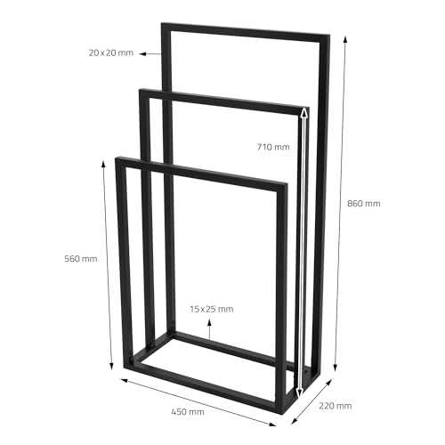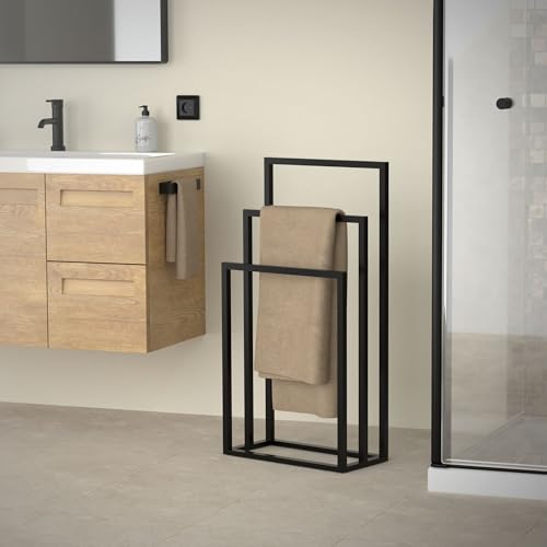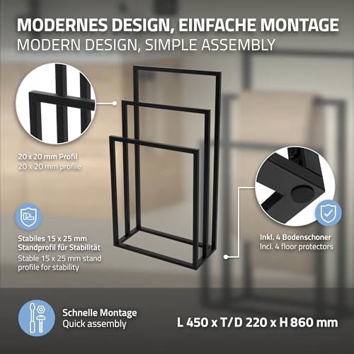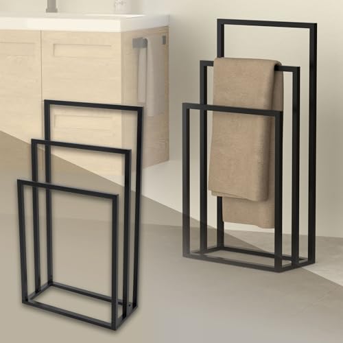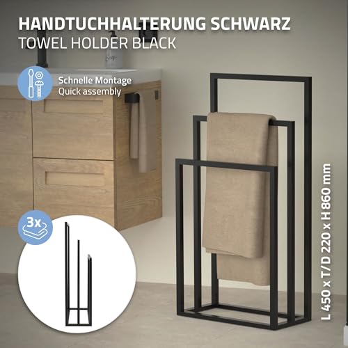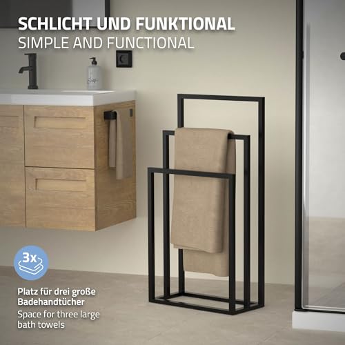 - Visible quality - The freestanding towel rail is made of strong, high-quality steel, is robust and stable, rust-proof and durable and has an elegant powder coating. Designed for use in moisture-rich bathroom environments. EASY CARE - Wipe clean with a damp cloth. Without the hassle of shaking or moving and has a long service life.
