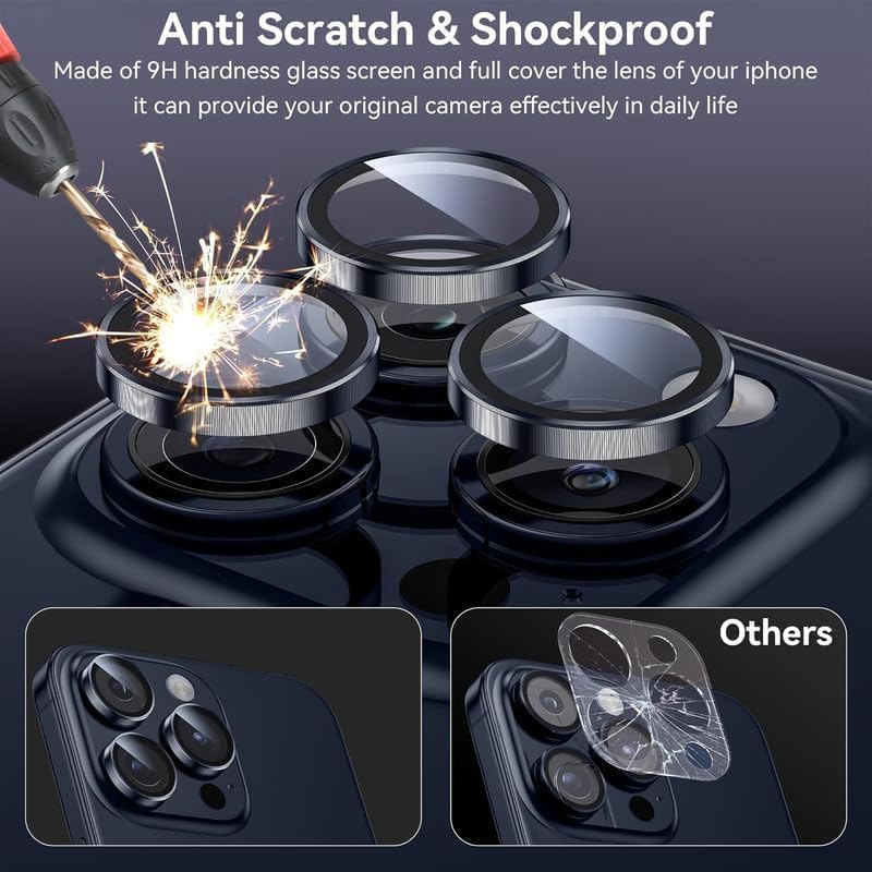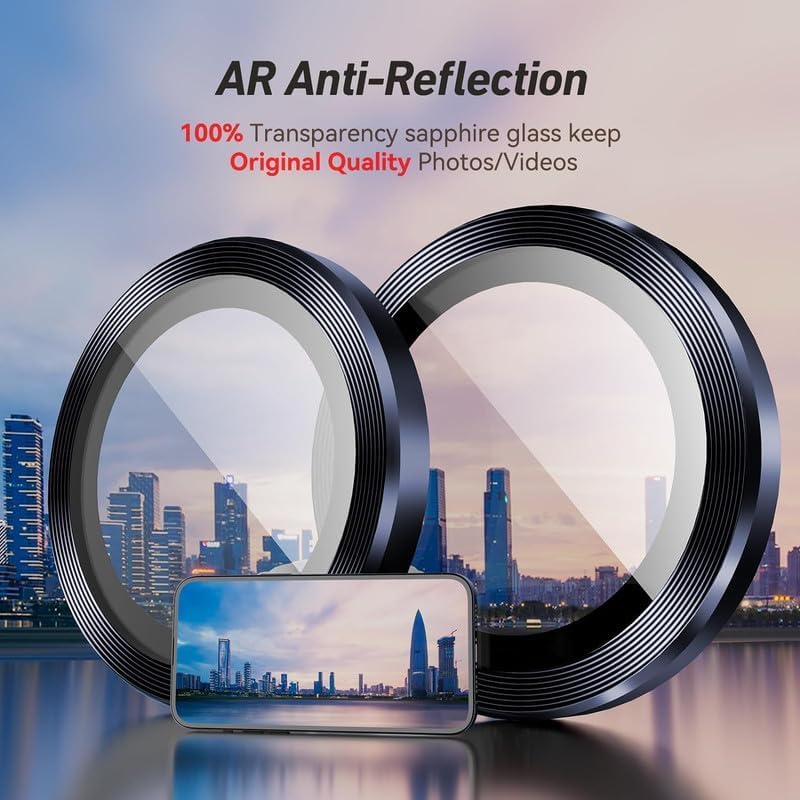 MOBILE MAGIC - واقي عدسة كاميرا بتصميم حلقي من خليط الألومنيوم مع طبقة دائرية من الزجاج المقوى لموبايل آبل آيفون 15 برو و15 بروماكس، بلون كحلي