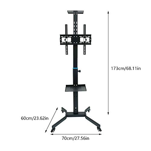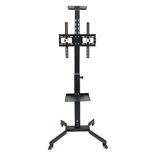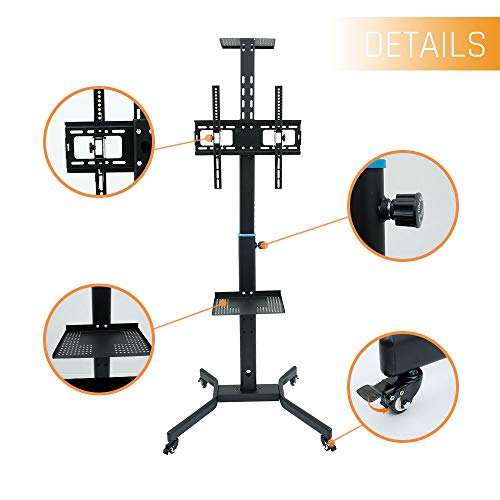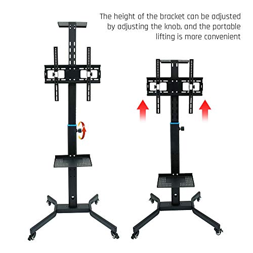 - 【TV Stand on Locking Wheels】Features easy movability or stationary use. This universal tv cart is made of solid steel base and structure, so it can support your TV sturdy and safely. "Safety Lock" designed to protect your TV not falling down or slipping aside.