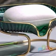 - This is a versatile acrylic soap dish with a durable gold metal stand, designed for multiple uses around the bathroom or kitchen, including holding soap and other small toiletries.