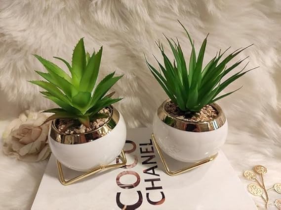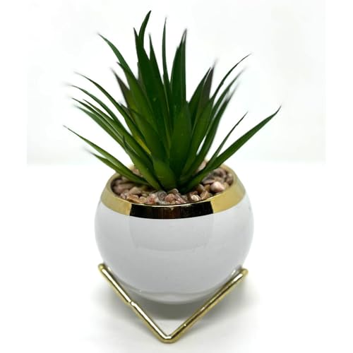Generic - نبات عصاري صناعي عصري في وعاء سيراميك مع حامل بحواف ذهبية، نبات صناعي صغير مزخرف (ابيض)