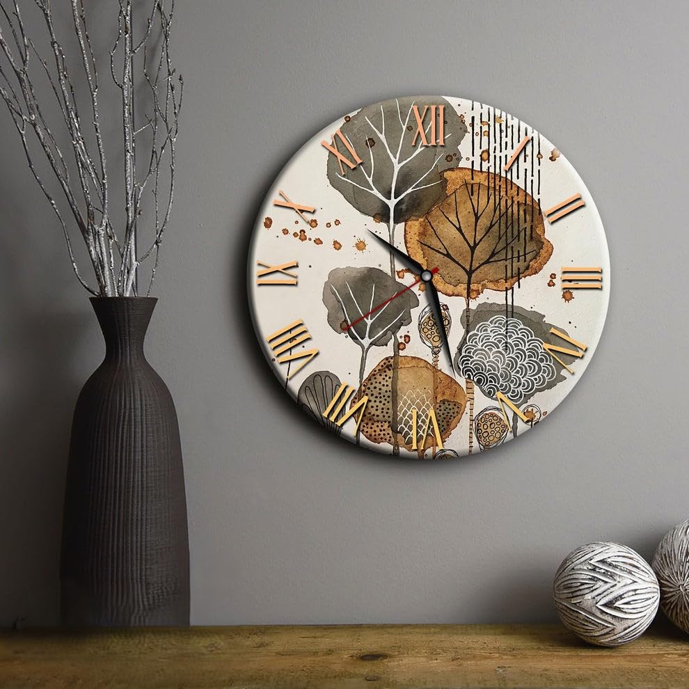 - DESIGN AESTHETIC: Modern round wall clock featuring artistic autumn tree patterns in brown and grey tones with elegant copper-finished Roman numerals