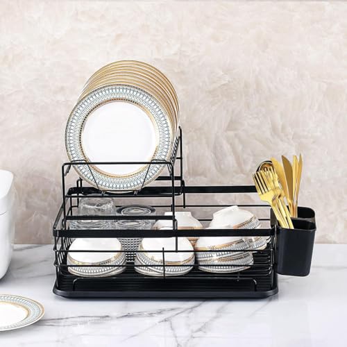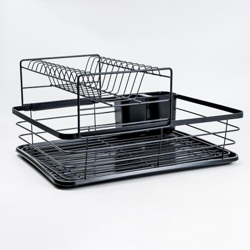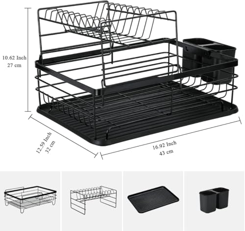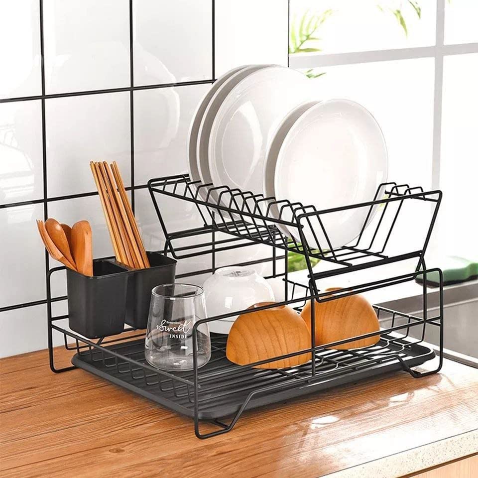 Generic - رف تجفيف اطباق المطبخ بطبقتين بتصميم امريكي عصري اسود مع تصريف مياه قوي