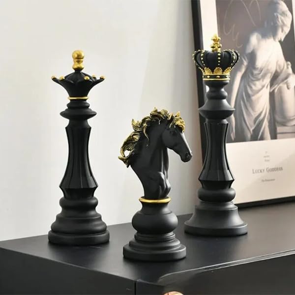 Generic - تماثيل ديكور عصرية على شكل قطع الشطرنج، لون أسود مع تاج ذهبي، مجموعة من 3 قطع، ديكور منزلي حديث