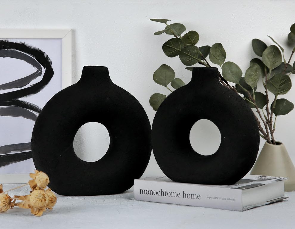 Generic - Modern Decorative Ceramic Vases, Round Donut Shape, Black Matte Finish, Set of 2