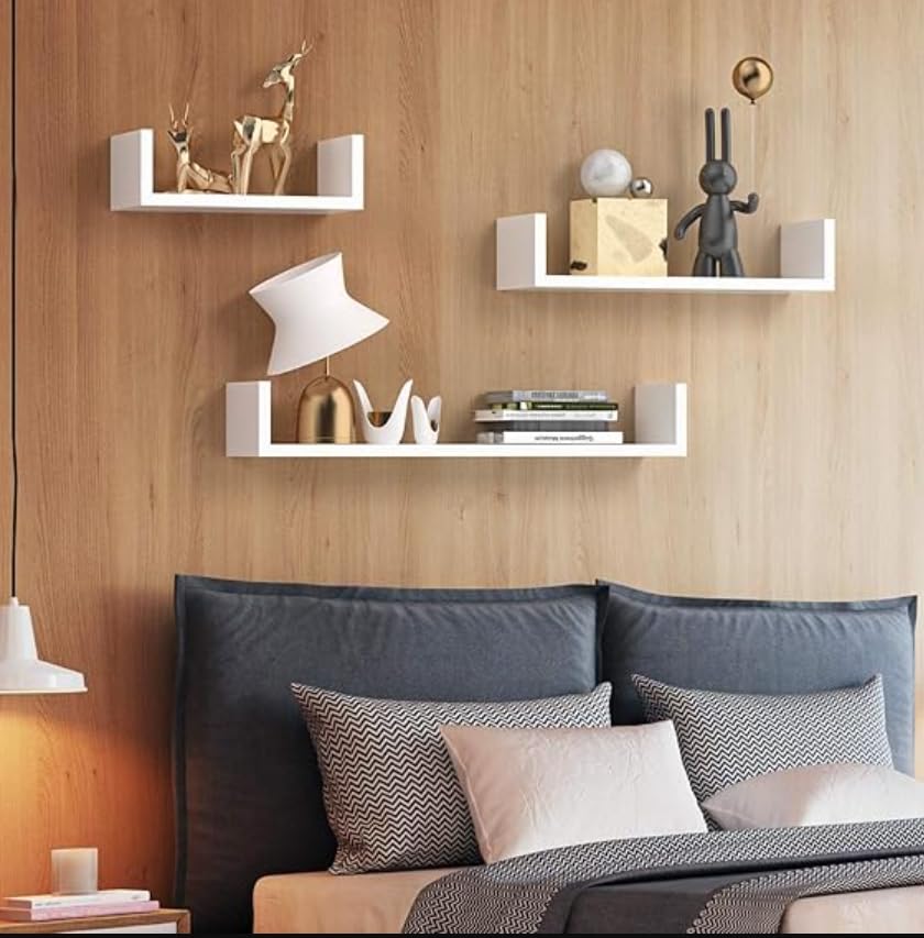 - VERSATILE DESIGN: Set of 3 modern U-shaped floating wall shelves in white, perfect for displaying decorative items, books, and collectibles in any room