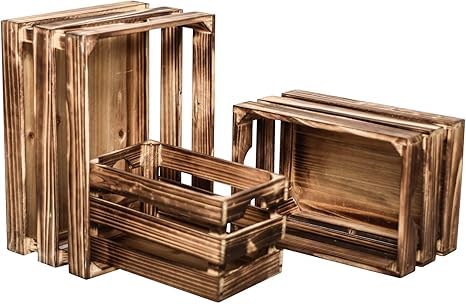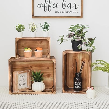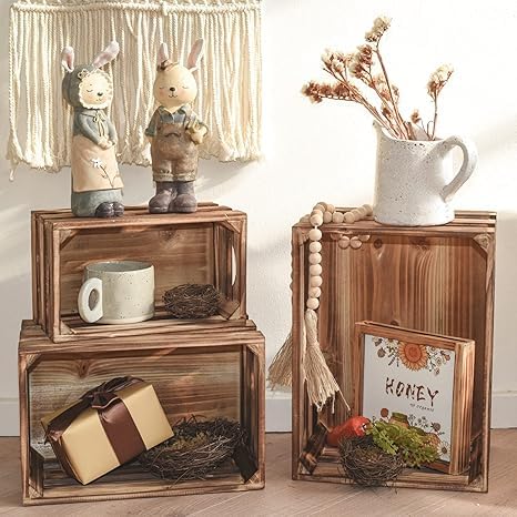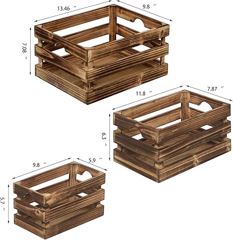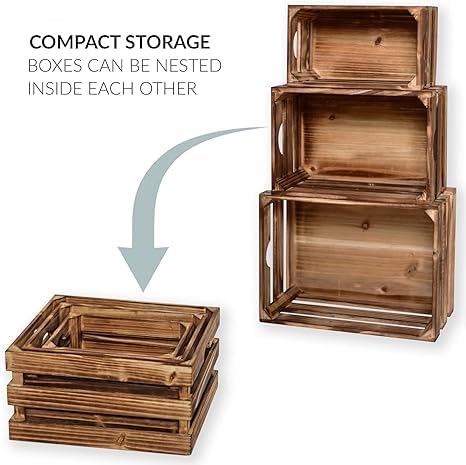 - تصميم متداخل: مجموعة من 3 صناديق تخزين خشبية ريفية تتداخل معًا بشكل مثالي، مصنوعة بلمسة نهائية بنية عتيقة من أجل سحر منزل المزرعة.