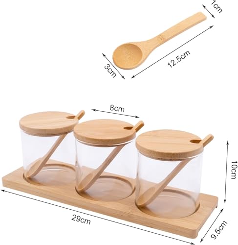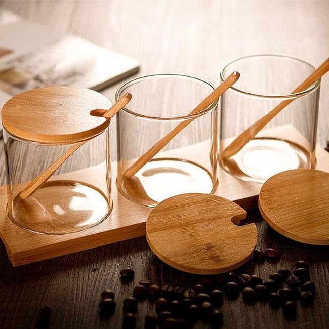 - COMPLETE KIT: Set of 3 Clear Glass Bowls with Elegant Bamboo Lids and Custom Wooden Stand