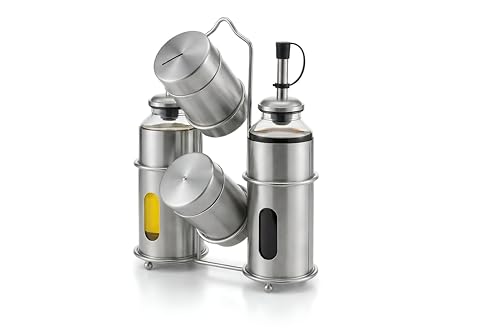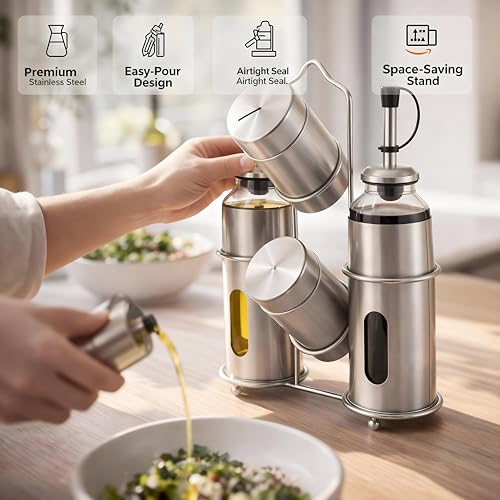 - This premium set includes two high-quality glass oil and vinegar dispensers with drip-free spouts, ensuring precise pouring control during cooking or table service, paired with stainless steel salt and pepper shakers featuring multi-hole lids for even distribution of seasonings.