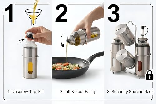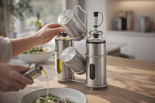 - Designed for one-handed operation, the dispensers and shakers feature intuitive pressure-activated openings that allow smooth, controlled flow of oil, vinegar, salt, or pepper—perfect for salad lovers, home cooks, or professional chefs.