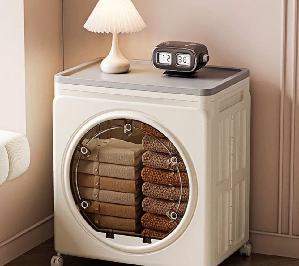 - DESIGN FEATURES: Modern storage cabinet with unique circular door design and smooth-rolling wheels for easy mobility, perfect for organizing linens and clothing