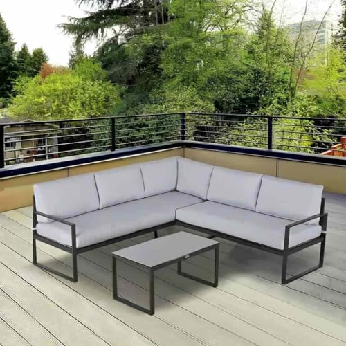 Generic - طقم اريكة مقسمة عصرية للاماكن الخارجية على شكل حرف L مع وسائد، اطار الومنيوم رمادي مع طاولة قهوة، اثاث فناء من 3 قطع