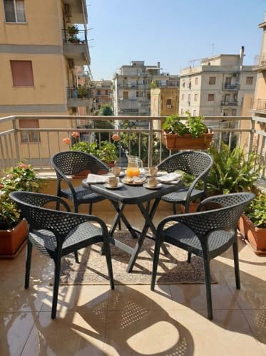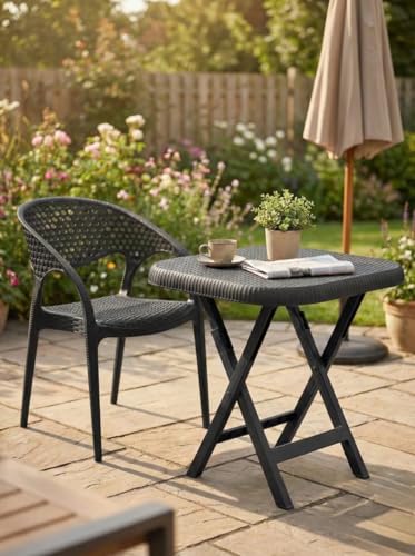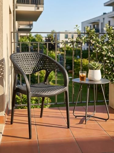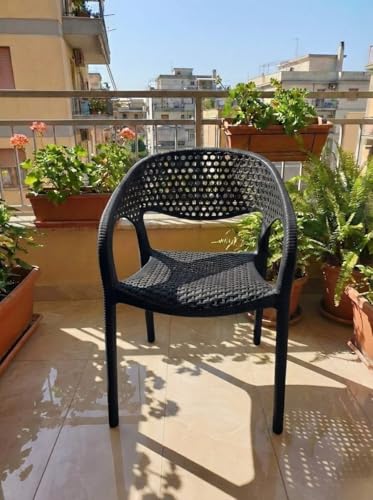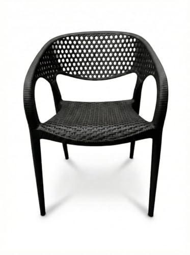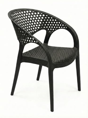 - Contemporary Style That Lasts: Combining the beauty of a woven rattan design and the durability of sturdy plastic, adding a chic touch to any place, both indoor or balcony and garden. PERFECT COMFORT: ergonomic design with armrests and clever vent back, ensures a comfortable and enjoyable session for long time without sweating. SUPERIOR DURABILITY: Made of the highest quality plastics that are sun, moisture, and break-proof, making it an excellent investment to live with you for years. FUNCTIONAL AND VERSATILE: Lightweight and very easy to clean, perfect for modern homes, cafes, restaurants, and outdoor gatherings.