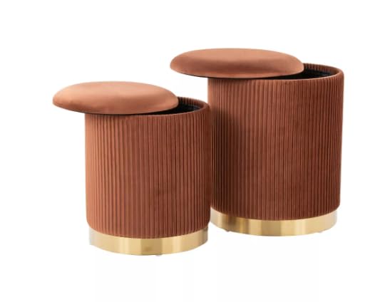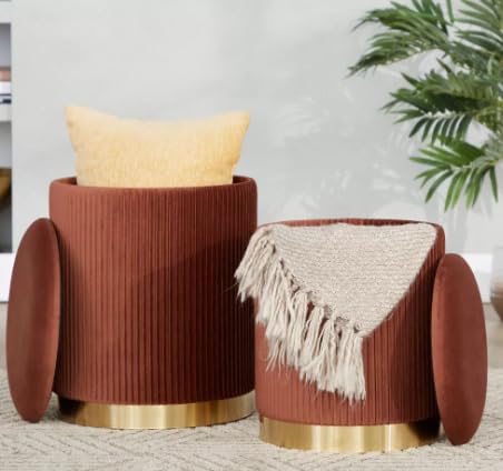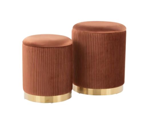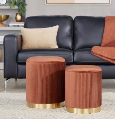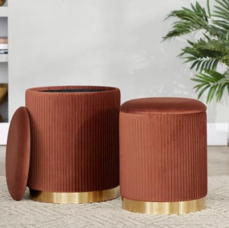 - SET OF TWO OTTOMANS: This elegant nesting pair includes two modern round ottomans with sophisticated ribbed velvet upholstery in a stunning terracotta orange colour, perfect for versatile placement throughout your home