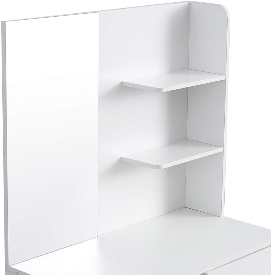- DIMENSIONS: Table provides comfortable workspace with shelving unit attached to create an efficient makeup and grooming station