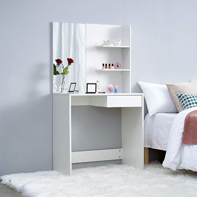 - SPACE-SAVING: Compact corner design maximises room space while providing ample surface area for makeup application and storage