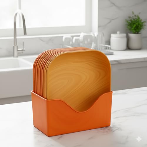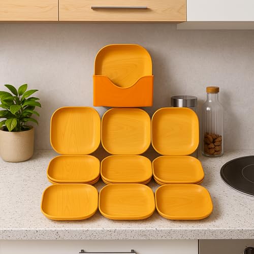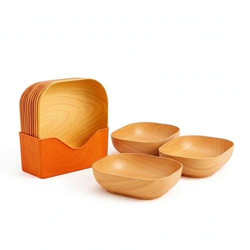 - COMPLETE SET: Set of 10 plastic serving plates with stylish wooden design with built-in organizer holder for organized storage
