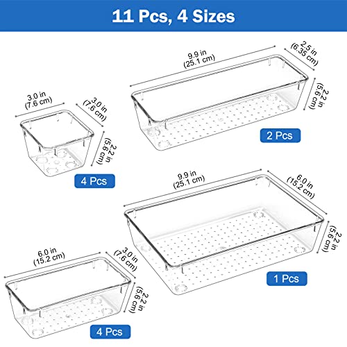 - Customizable and Modular Layout: This 11-piece set includes multiple tray sizes that can be interlocked and arranged in various configurations to perfectly fit your drawers and organize your items.