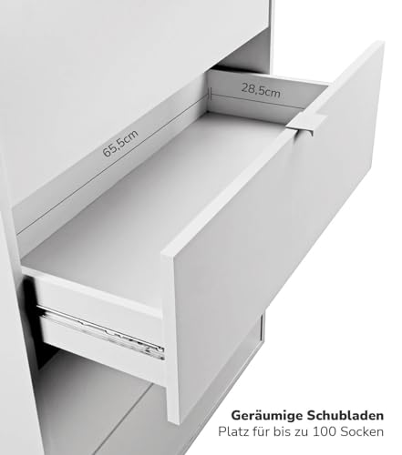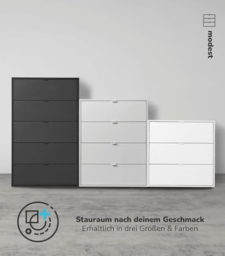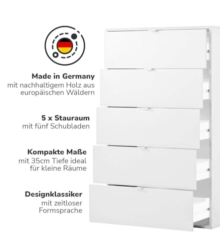 - Quality made in Germany. The chest of drawers impresses with its timeless design for any interior style and is produced locally in NRW from chipboard with durable melamine coating. Functional features and classic design make the sideboard an interior classic.