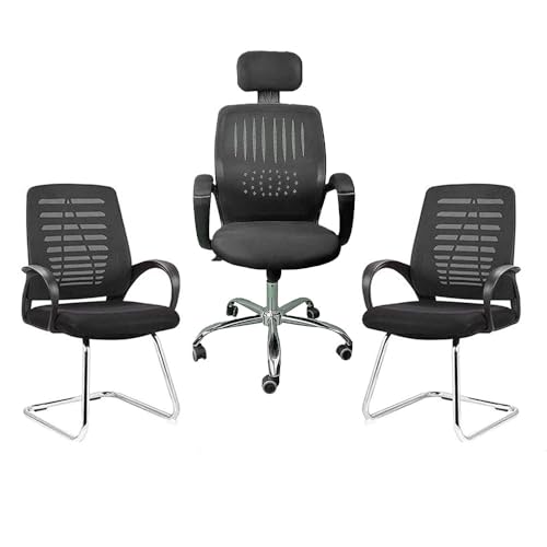 - مجموعة كاملة: تتضمن كرسي مكتب شبكي تنفيذي مع مسند رأس وكرسيين متطابقين للضيوف بتصميم قاعدة مزلقة من الكروم الأنيق