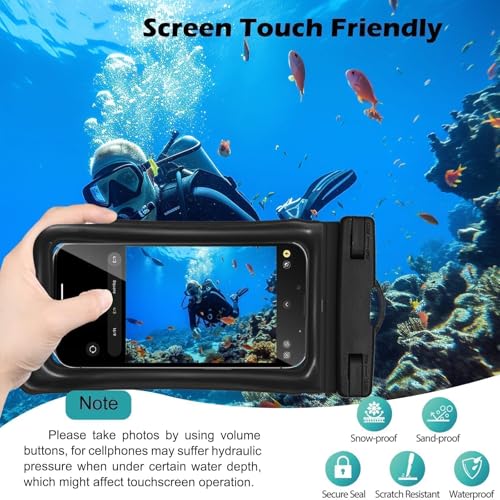 - [Touchscreen Friendly & Ultra Clear Photo Underwater]: The Beach Travel Essentials waterproof phone pouch utilizes high light transmittance transparent technology, enabling you to capture crystal clear photos of the underwater world. It is also touch-friendly, allowing you to use text, emails, and other touchscreen functions without any hindrance. Please note that it does not support Touch ID fingerprints. Additionally, when taking photos, it is recommended to use the volume buttons for capturing images.
