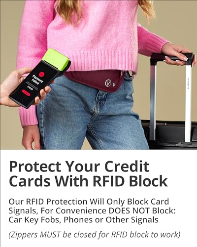 - RFID Protection on your Credit Cards - Don't fall victim to electronic pickpockets! Our travel belt bag is equipped with RFID blocking technology to protect your credit cards. Note: It's designed to block signal from credit card and will not block signal from Key Fobs and other devices