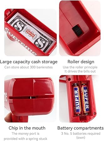 - سهل الاستخدام: تصميم بسيط على شكل مسدس يسمح برش النقود الورقية أو القصاصات بطريقة ممتعة ومبتكرة