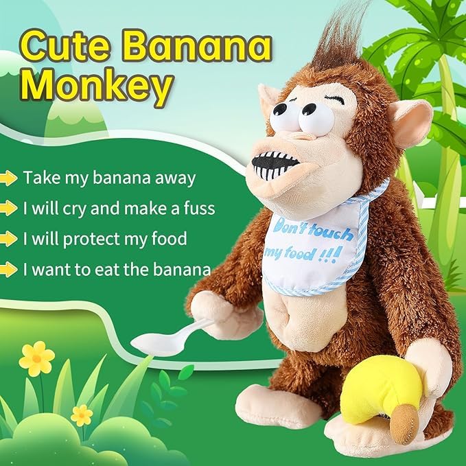 - تفاعل مضحك وحقيقي: يبكي، يصرخ، يلوح بذراعيه ويركل رجليه إذا حاولت أخذ الموزة، ثم يهدأ عند إرجاعها.