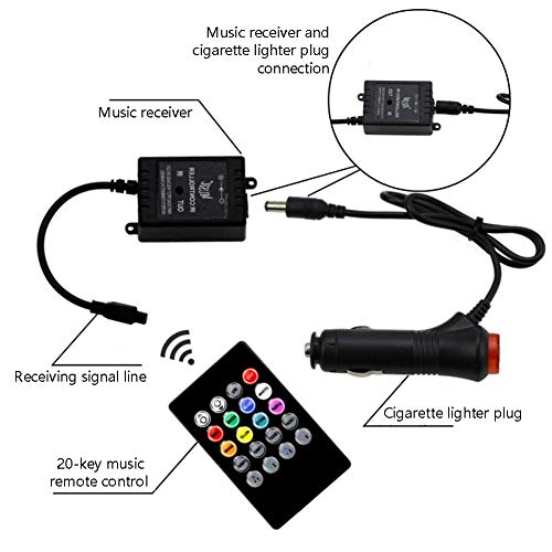 - 12V car interior lighting kit, remote control and car charger are equipped with low-voltage RGB light strips, just plug in the ready-to-use cigarette lighter to use.